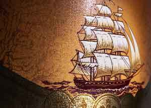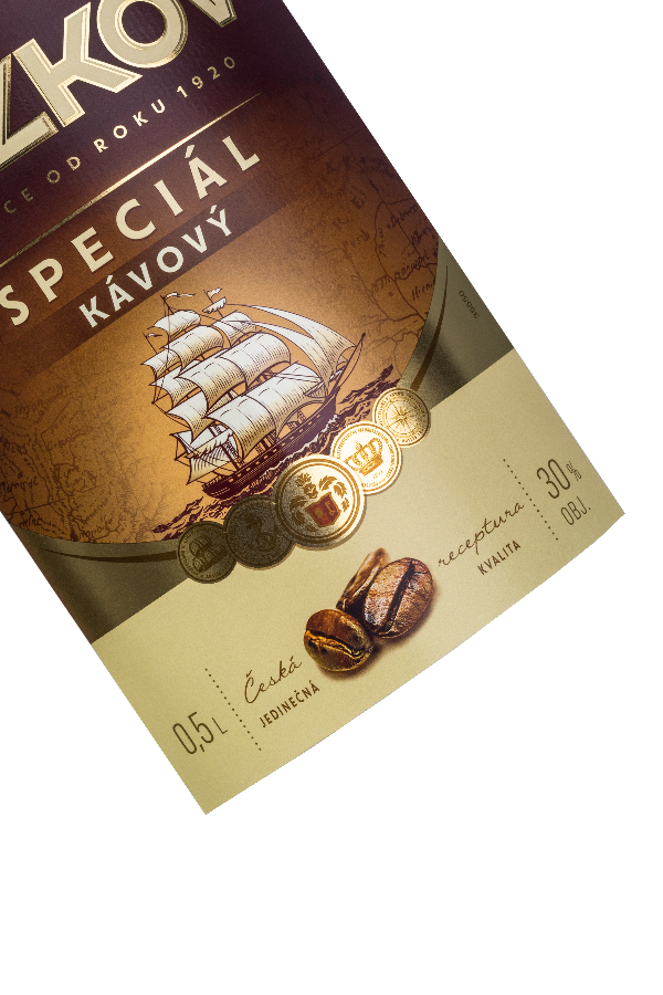 Bei diesem Etikett wurde eine strukturierte Papieroberfläche durch Prägung simuliert. Im Zusammenspiel zwischen Fläche und Detailprägung der Motivelemente ergibt sich besondere haptische Wirkung: Die Illustration wird zusätzlich durch einen glänzenden Lack hervorgehoben, Münzen, Linien und Outline der Typografie durch Kaltgold. Das Bildelement wirkt gestochen scharf und entspricht beinahe einer Bildwiedergabe in 4K.