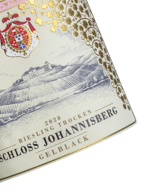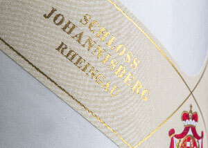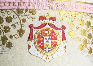 Wappen und Rebenblattornamentik werden durch das sensibles Zusammenspiel von Prägung und Gold-elementen in feinsten Linien als optischer rahmenhervorgehoben. Die kupferstichartige Zeichnung der Illustration wird betont und wirkt wie ein wertvolles Kunstwerk.